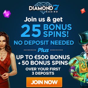 Diamond7 Casino offre à tous les nouveaux joueurs 25 Tours de Bonus Sans dépôt lors de l'inscription! Les joueurs recevront également un énorme bonus de bienvenue allant jusqu'à 500€. Non disponible au Royaume-Uni.